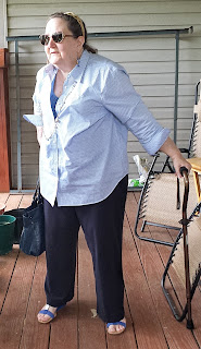 Wednesday is full of woe (or so the rhyme would have it), and woe = blues, so that's what I wore. My very old royal blue East Fifth trousers, with a blue & white checked Lauren by Ralph Lauren shirt, the bright blue Alfani sandals, the navy purse, the heavy golden & rhinestone chain, and some cute articulated fish "fishhook" earrings. Disco found them at a flea market and bought them for me, she's so sweet!